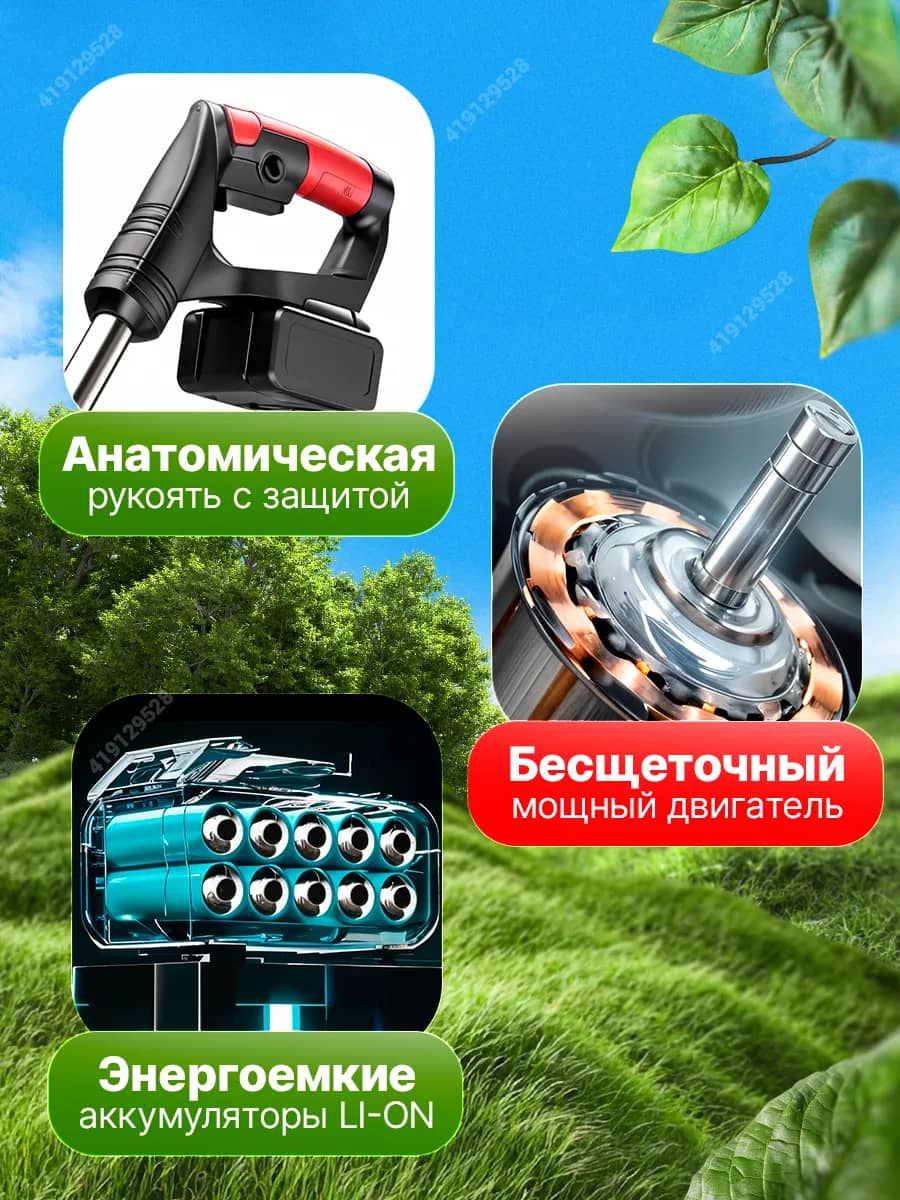 Он оснащен мощным электрическим двигателем, который работает от аккумуляторной батареи. Благодаря этому, вы можете свободно перемещаться по участку без проводов, что обеспечивает удобство и безопасность работы.