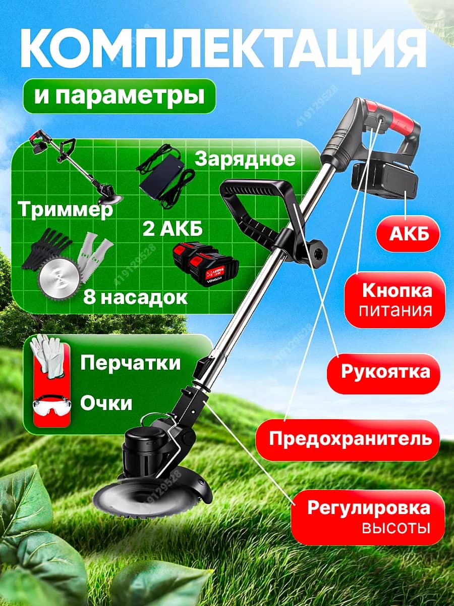 Триммер аккумуляторный садовый имеет регулируемую длину рукоятки, что позволяет настроить ее идеально под ваш рост. Это обеспечивает комфортную и эргономичную работу, не нагружая вашу спину и руки.